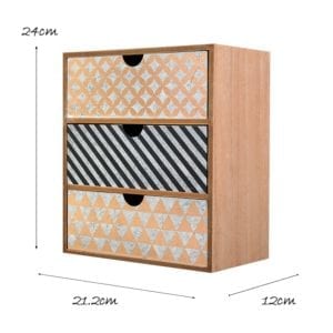 Modern Stylish Small Wooden Cabinet holds 3 drawers with different geometric patterns. Ideal for storing items like key, letters, notebook, earphone, craft, card, and small little to keep safe. It also would be a great stylish decor on your table room house or office.