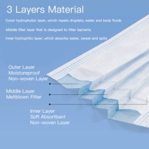 - 3 Layers of protection. Outer hydrophobic layer repels droplets, water, and body fluids. The Middle filter layer is designed to filter bacteria. The inner hydrophilic layer absorbs water, sweat, and spits.