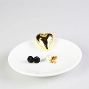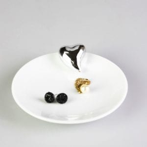 If you are searching for delegate plate on your desk to storage of small but important things like jewellery, keys or coins, this white ceramic plate with a heart would be your best option. With a heart coloured in gold or silver, it would not only be useful but also decorative on your table.