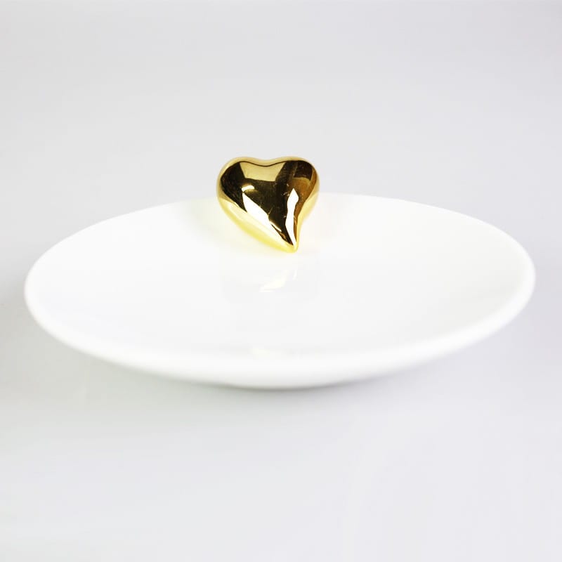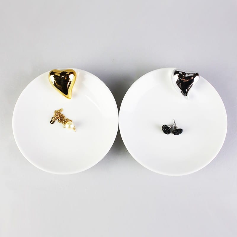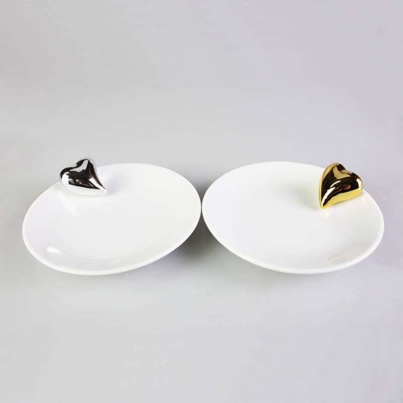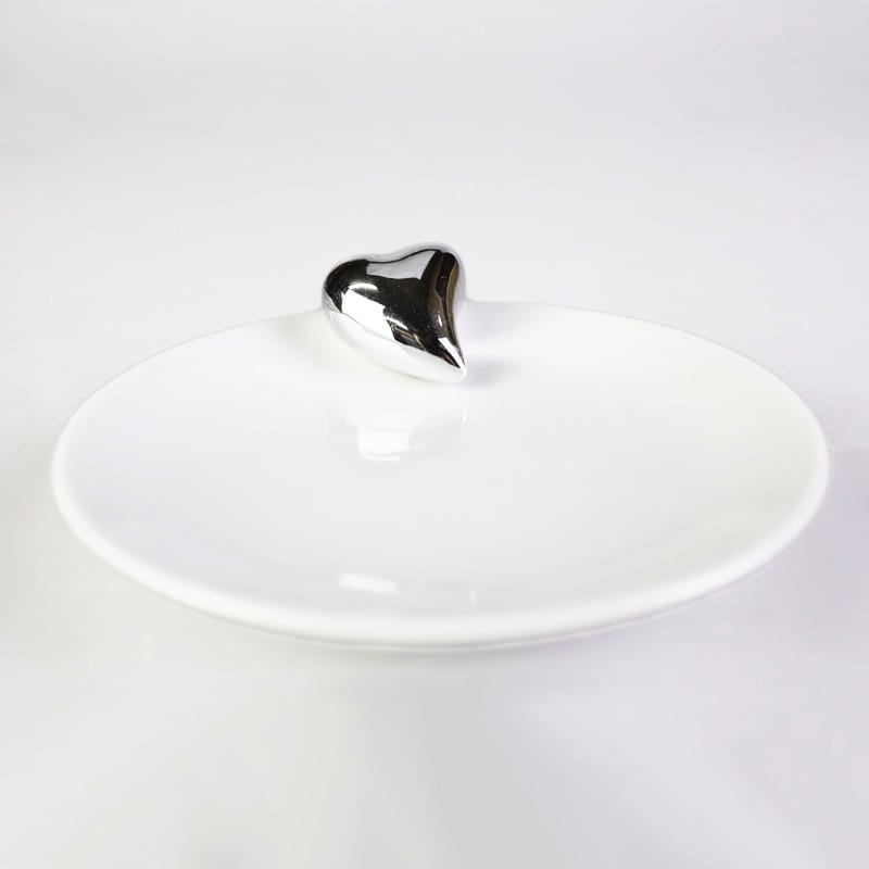 If you are searching for delegate plate on your desk to storage of small but important things like jewellery, keys or coins, this white ceramic plate with a heart would be your best option. With a heart coloured in gold or silver, it would not only be useful but also decorative on your table.