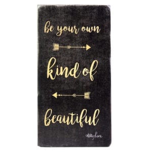 Get this Beautiful Arrow Plaque Block to remind yourself to be your own kind of beautiful. It can be hung on the wall or place on flat surface such as on the shelf or table top. It is made of MDF material with a black colour background and pale ochre inspirational quote. There is a nail slot at the back for hanging.