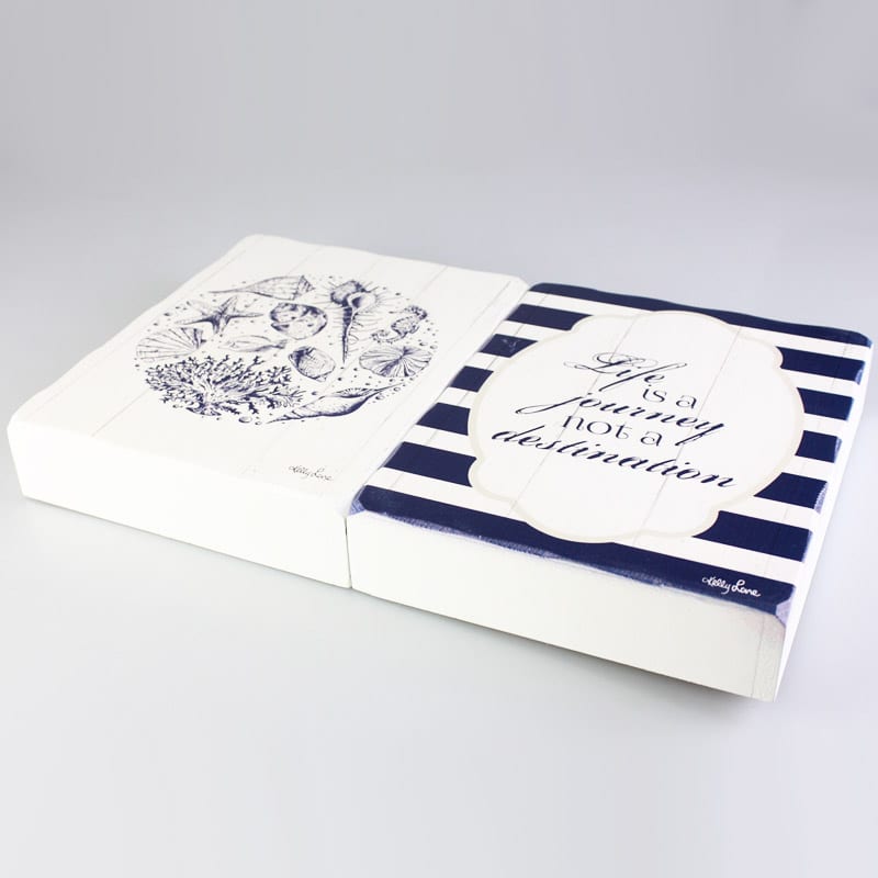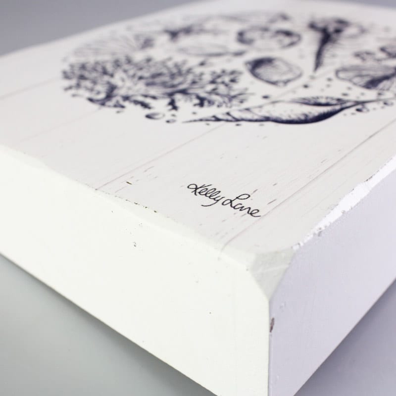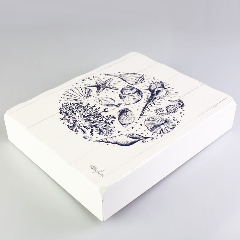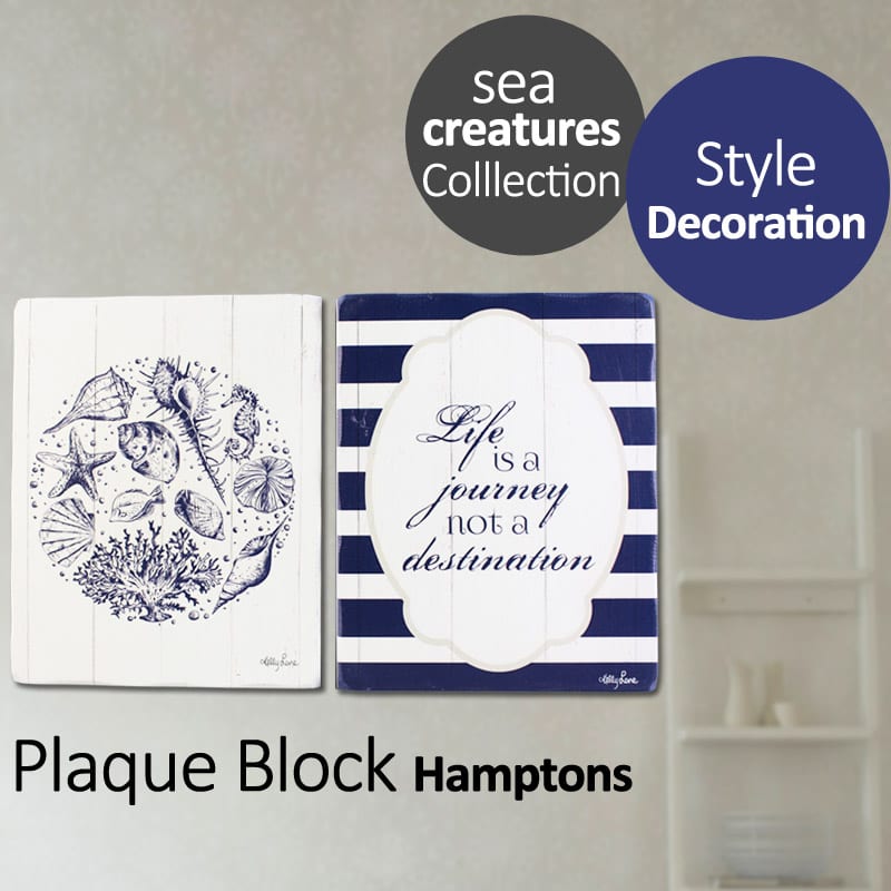 This plaque block features a lovely mosaic of seashells, corals, and seahorse. The sand-coloured wood medley background creates a round frame for these beautiful gems. This is the perfect gift for someone enjoys creatures of the sea! Combine with other pieces from the Hamptons collection to create your own remarkable story. There are two style options: Coral or Journey.