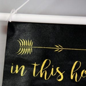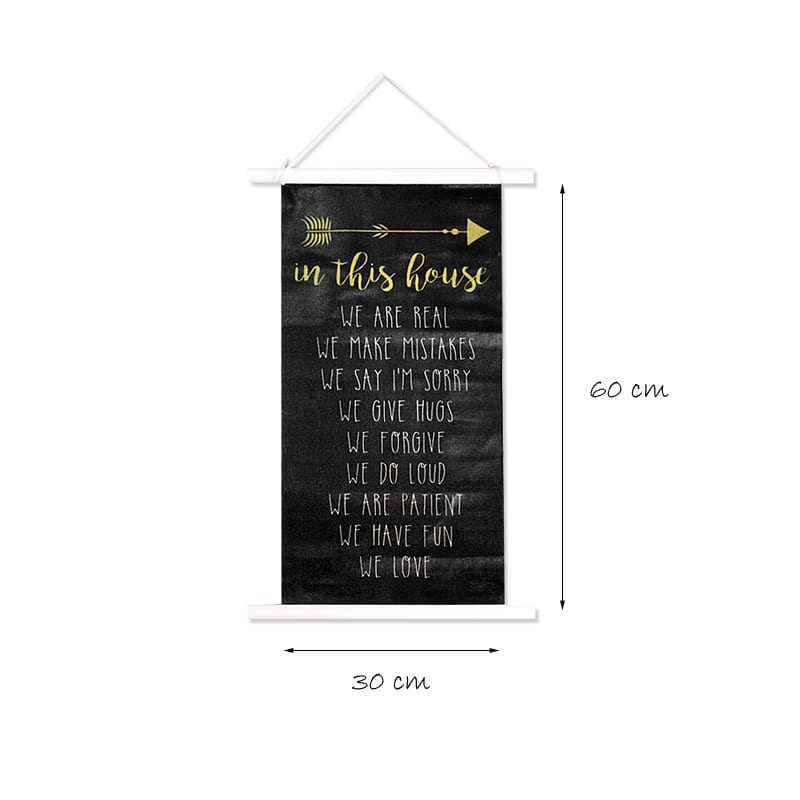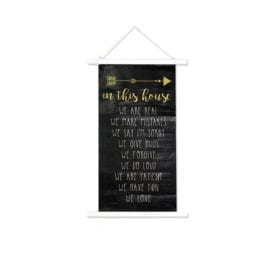 This Arrow House Canvas Scroll is a printed artwork on a scroll. It has a black background with arrow print and a list of house rules. There is a rope tied on the top for hanging on the wall. Just scroll it up for easy storage.