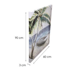 This beach-themed Palm Single Boat Oil Painting is a printed canvas art with a few dashes of hand-painted paints over the printed art for subtle textures. There is some visible real sand stuck on the sandy ground that you can actually see and feel them when touched. A pair of metal plates and 4 nails are included so that you can fix them at the back of the painting to hang it up onto the wall.