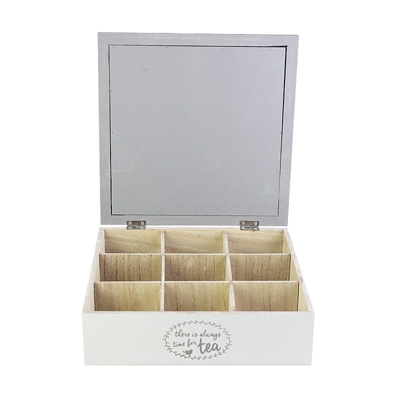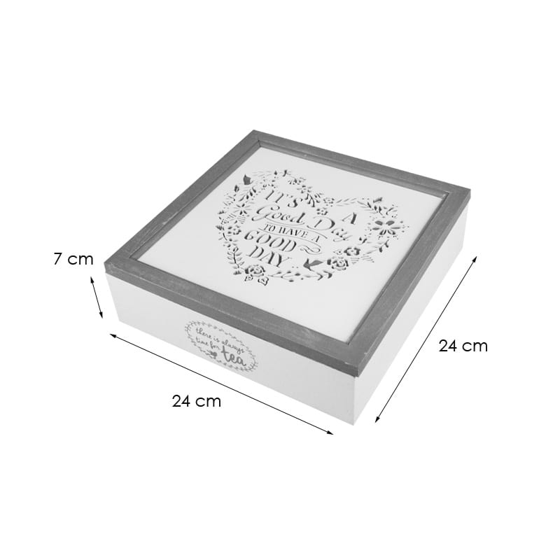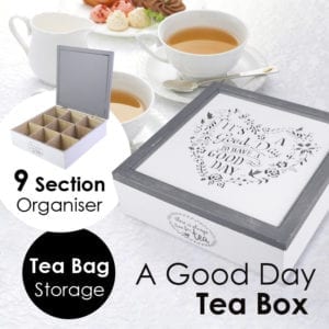 Store your favourite tea bag collection in this A Good Day Wooden Tea Bag 9 Section Storage Box. These beautiful and functional tea bag storage box features a cutout wooden art on the lid and it is made of wood. The box is divided into 9 sections. Place your tea bags in the box and place it around your kitchen or coffee table to enjoy a cup of tea anytime anywhere at home.