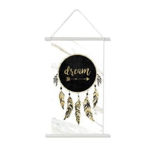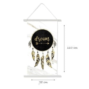 This Feather Dream Canvas Scroll is a printed artwork on a scroll. It has a black background with dreamcatcher feathers and the word Dream in the middle. There is a rope tied on the top for hanging on the wall. Just scroll it up for easy storage.