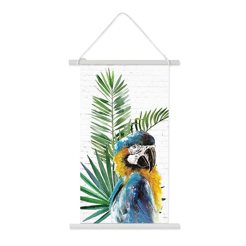 This Rio Blue Parrot Canvas Scroll is a printed artwork on a scroll. It is a Rio theme hanging wall art with palm leaves and a blue parrot. There is a rope tied on the top for hanging on the wall. Just scroll it up for easy storage.