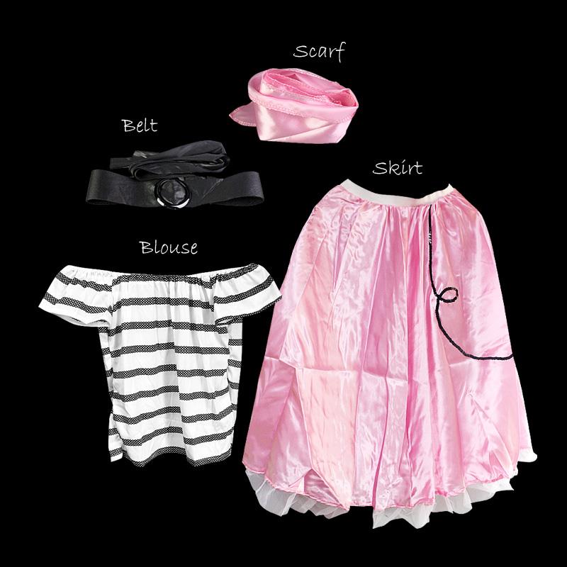 This Adult Costume Sandra Dee for ladies features a cute blouse with a pink skirt, a pink scarf, and a black belt. One Size fits most and suitable for adult ladies. Get one for yourself now to dress up as Sandy in Grease and enjoy the party.