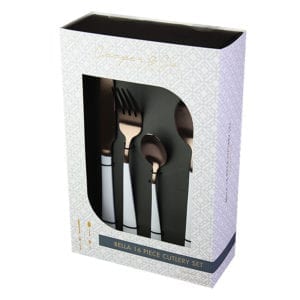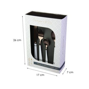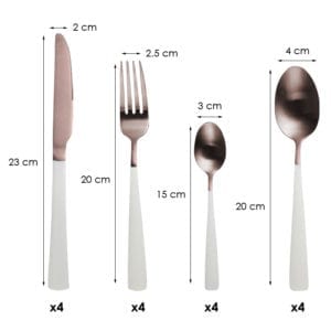 The Cooper & Co. Bella Two Tone 16 Piece Cutlery Set features a two tone design where the top part of the cutlery is copper colour while the handle and is white. It is made of stainless steel and dishwasher safe material. It comes with 4 knives, 4 forks, 4 teaspoons and 4 tablespoons. All packed in a beautiful box. Its elegant style gives your dining area a touch of classy taste. It is suitable to give away to someone as a gift as well.