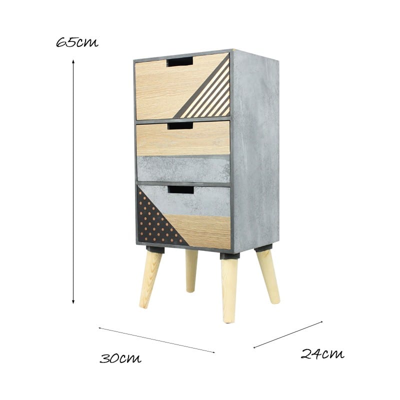 Modern Stylish Geometric Design Cabinet holds 3 drawers with different geometric patterns and durable wood. Ideal for storing files, earphone, craft, big items to keep safe. This cabinet is the perfect addition to any home, room or office.
