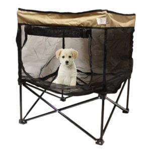 Portable and lightweight pet kennel keeps pets cool, safe and secure. Comes with convenient carry case. Take it to the beach, park, visits to friends, outdoor gatherings. Zippered door rolls up and secures in place with hook and loop closures.