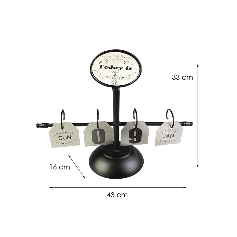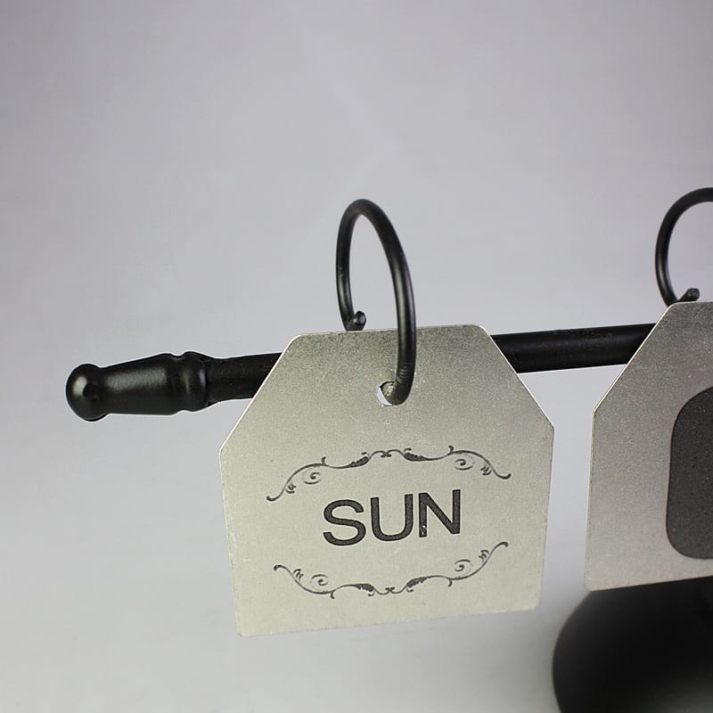 This Vintage Iron Calendar With Hanging Metal Plate Day Month Display features a black iron pole with hooks for hanging the metal plates that display the day and month. It is suitable for decorating your study desk, shelf or mantelpiece to display the day and month manually. Its vintage design creates a homey atmosphere in your house.